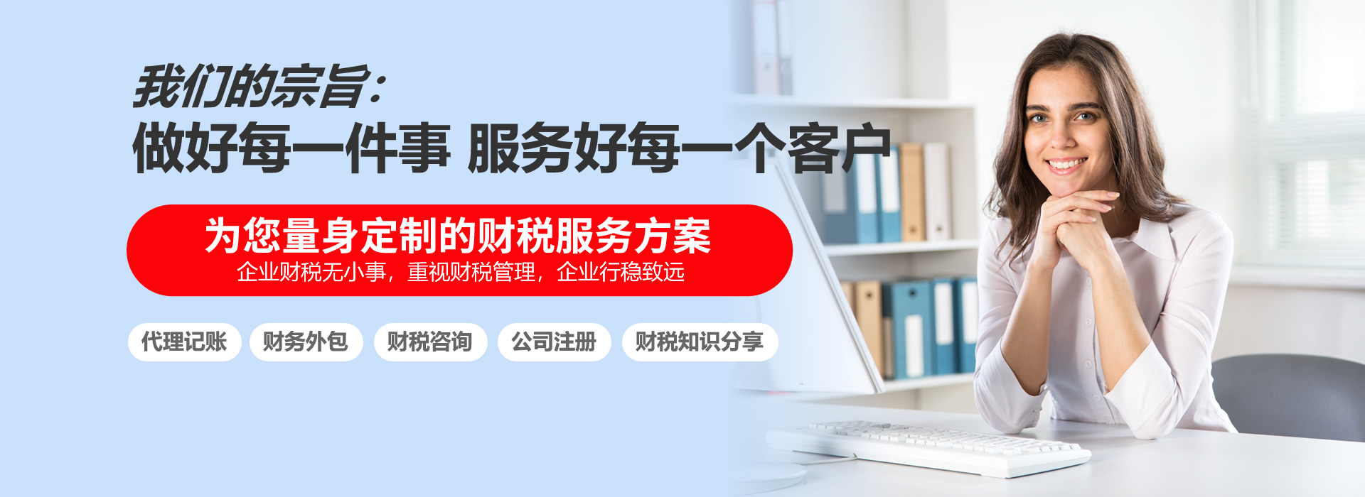 公司愿景:致力于为中小企业主提供专业的财税支持,致力于为财务工作者提升自我实现自我而努力奋斗。